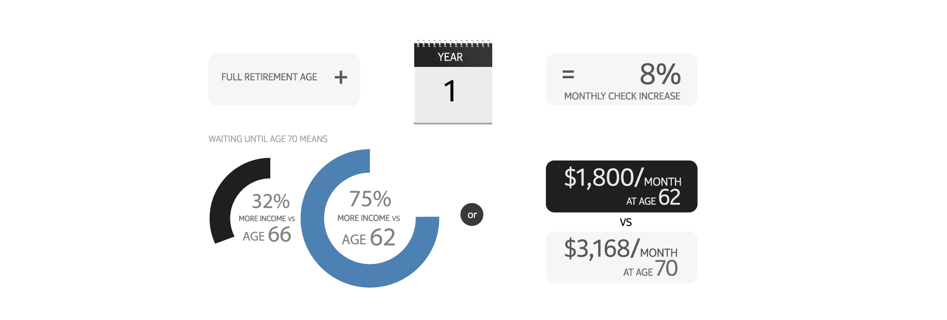 Waiting until age 70 means receiving 32% more retirement income versus age 66, and 75% more income compared to age 62. That's $1,800 per month at age 62, versus $3,168 at age 70.