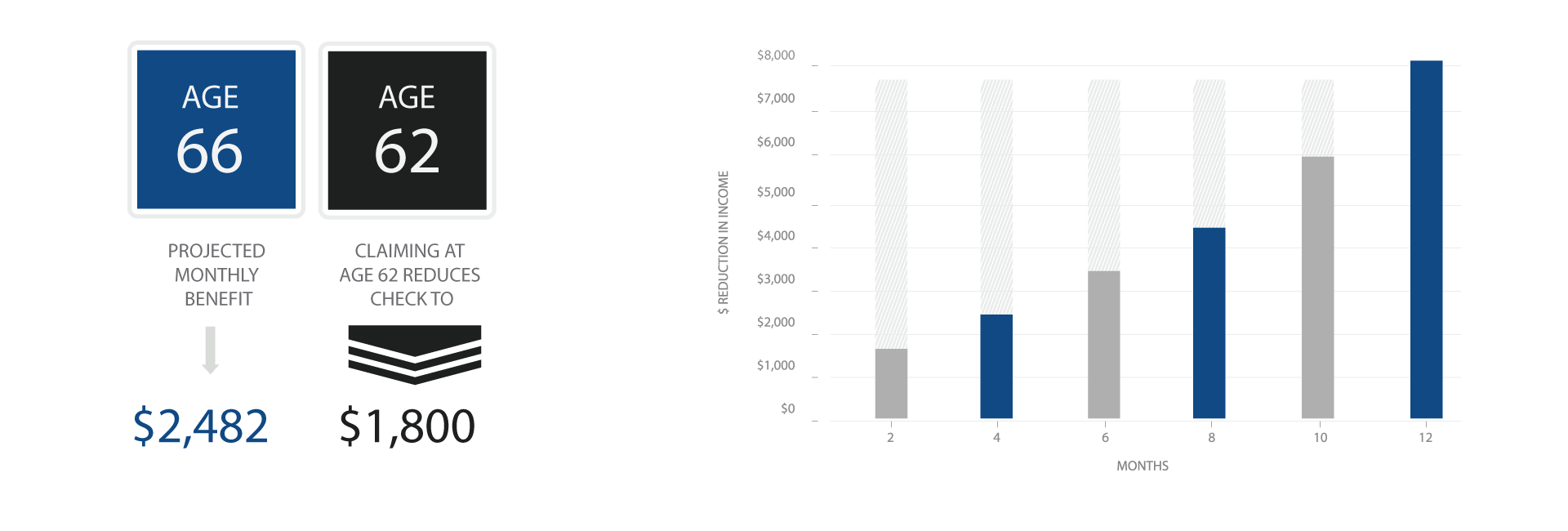 Let's assume that your age 66 projected monthly retirement benefit is $2,482. Claiming benefits at age 62 reduces the monthly check from $2,482, to $1,800.